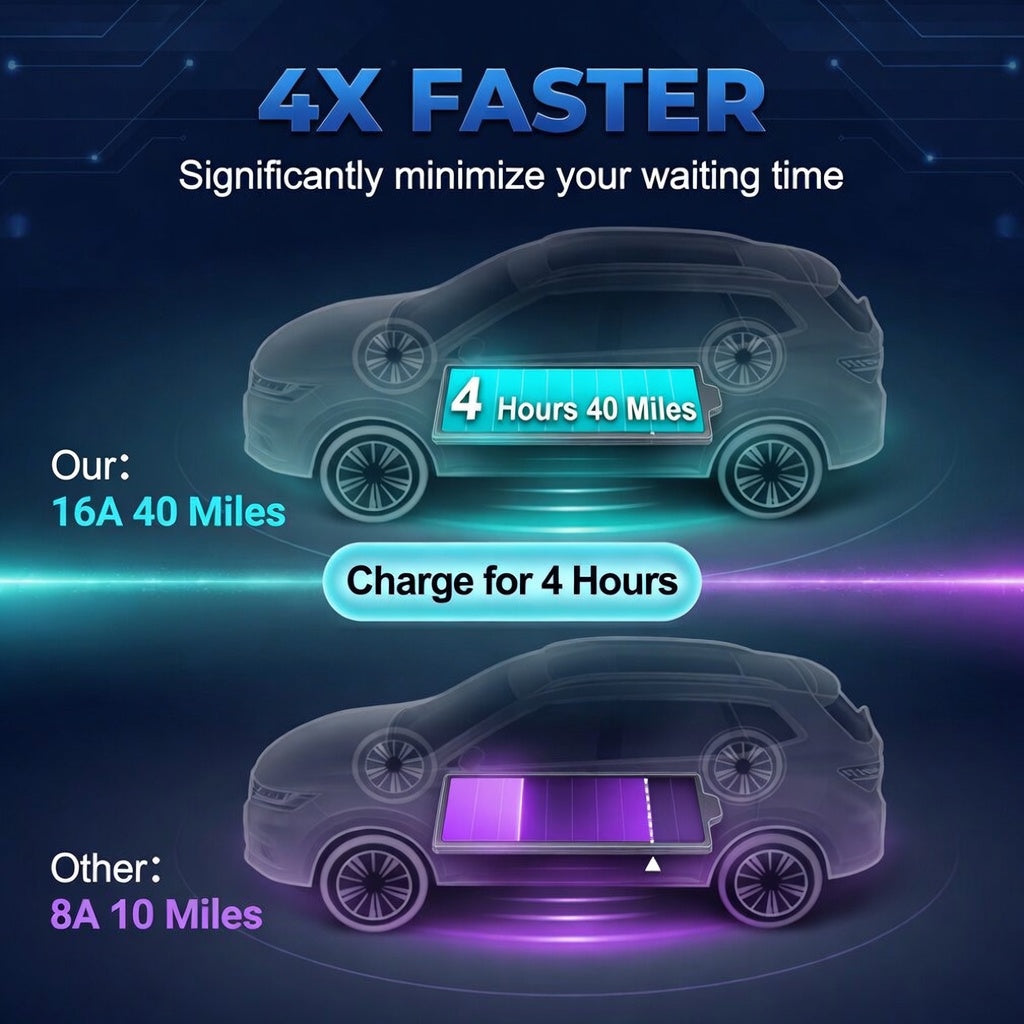 Minimize your waiting time and get back on the road faster. Our 16A portable EV charger can give your car up to 40 miles of range in just 4 hours, compared to a standard 8A charger that only adds 10 miles in the same time.